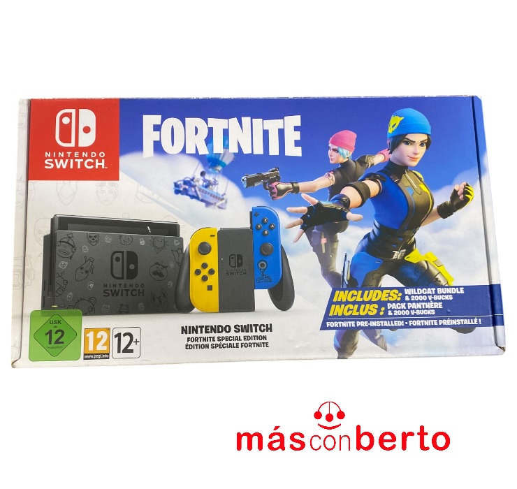 Consola Nintendo Switch Edición Fortnite, incluye caja original (le falta el soporte de los joy-con y el cable HDMI, cargador compatible)