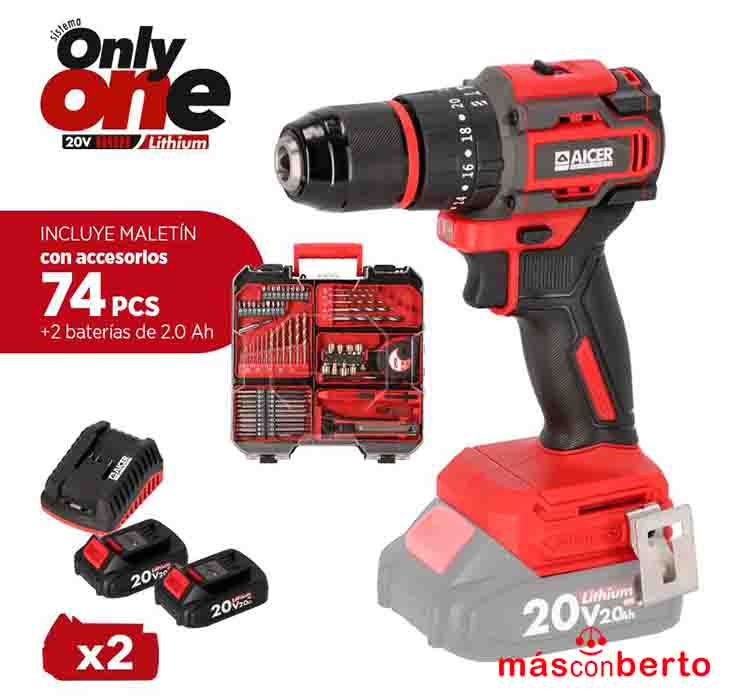 Taladro Percutor 20V + 74 Accesorios Only One Aicer (2X 2.0AH) AC1738